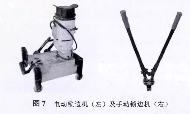 2)手動鎖邊機,在用電動鎖邊機之前先用手動鎖邊機鎖緊板端,以便于電動鎖邊機入位,見圖7(右)。