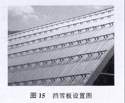 北方地區(qū)的屋面一般需要設(shè)置擋雪板。擋雪板材質(zhì)一般為不銹鋼或鋁合金。擋雪板可根據(jù)屋面的基本雪壓和坡度來布置。天溝及檐口上方必須設(shè)置擋雪板,擋雪板的設(shè)置見圖15。