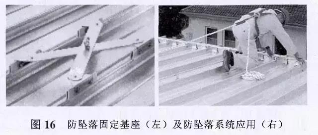 屋面的定期檢查、暴風(fēng)雪后清潔屋面和天溝、屋面改造,這些都需要屋面設(shè)置防墜落系統(tǒng)。防墜落系統(tǒng)包括一個堅固、耐久且靈活的不銹鋼索,該不銹鋼索的每一端連接到屋面固定基座支架上。屋面固定基座使用鋁夾,連接到屋面板上。屋面固定基座被設(shè)計為減震器,一旦墜落發(fā)生,將變形減弱墜落的震動,并保障基座仍然安全地固定在屋面板上。